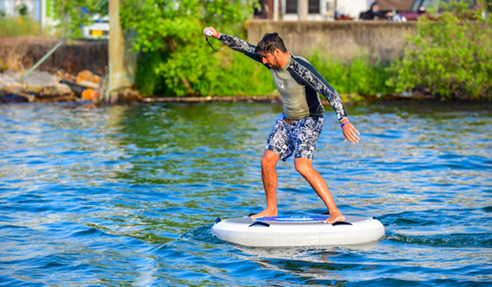 体重をかけるだけで進行方向を操作することができる電動の円形ボード状の乗り物。円形のボード上で進みたい方向と逆に体重をかけるとセンサーが傾きを検知し、モーターとプロペラの駆動で水面の移動を楽しむことができる。シンプルで直感的な操作性でありながら、乗りこなすために適度な技術が必要なため、マリンアクティビティの入門編として幅広いユーザーに新しいワクワク体験を提供することだろう。