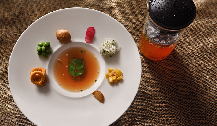 調理テクニックやテイスト、グラスやお皿の上でのプレゼンテーションにおいて、インドの文化と伝統を受け継ぎながら、スパイスの魔法を巧みに操り、これまでのインド料理とは全く異なるエレガントでガストロノミックな境地へと昇華させた新しいスタイルのモダンインディアンキュイジーヌを創り上げる。