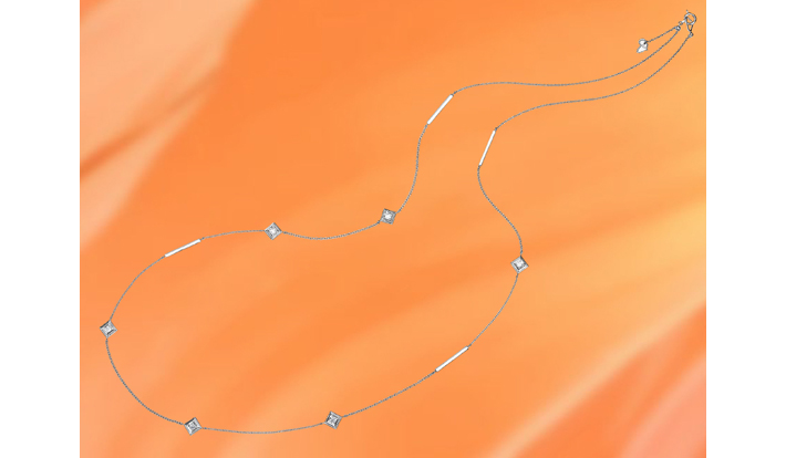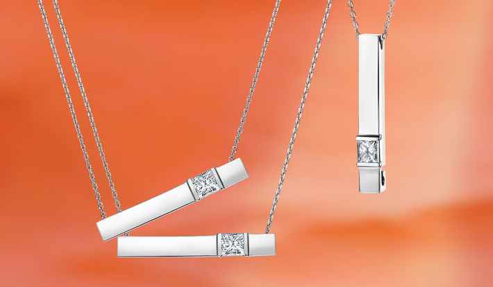 そのプリンセスカットのダイヤモンドを一粒あしらい、トップ裏面の溝に沿ってチェーンを入れれば、縦にも横にも着用できる2way タイプの躍動感あふれるネックレス。