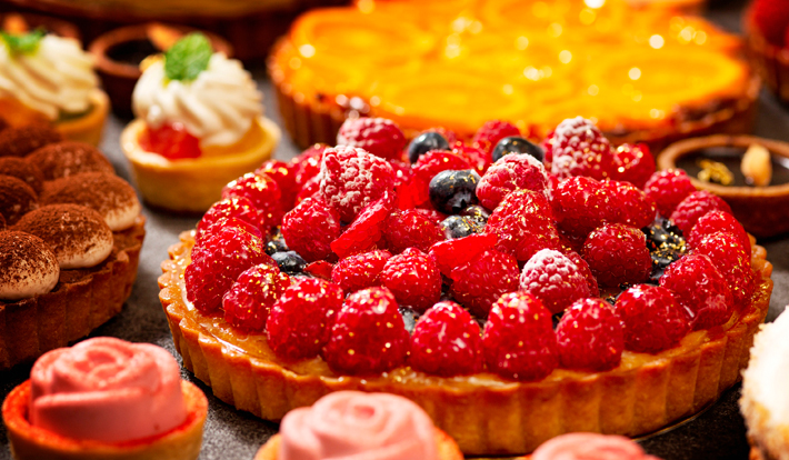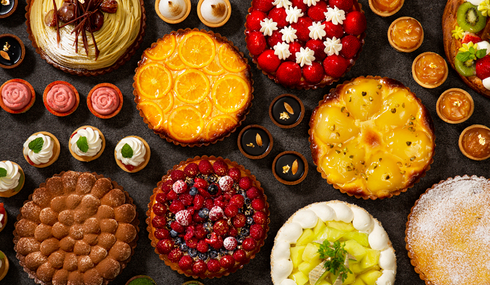 洋梨やいちご、 オレンジ、 メロン等フルーツをふんだんに使ったタルトの他、 シトロンやバラをモチーフにしたプティタルトが並ぶ。