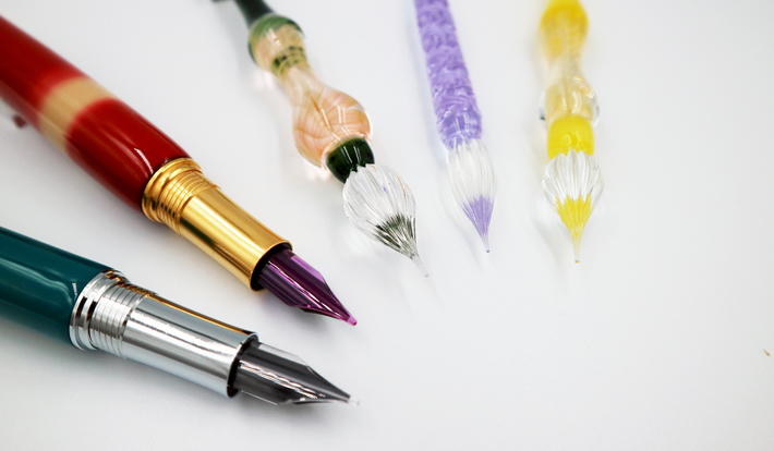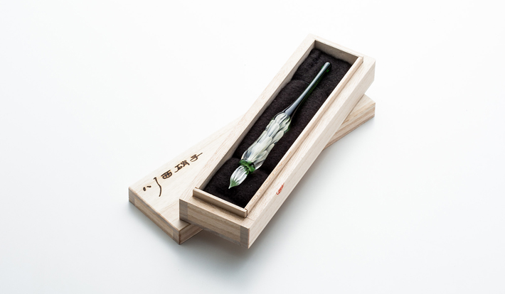 また川西硝子からは「新色ガラスペン」が初お披露目。 ペン先の溝について、 8~10本が一般的なところ、 川西硝子は12本の溝が均等に刻まれていることでインクの吸い上げを良くしており、 約500文字程度もの文字を書くことができる。 ガラスペンのイメージを覆すスムーズな書き味が楽しめるのも川西硝子の特徴だ。