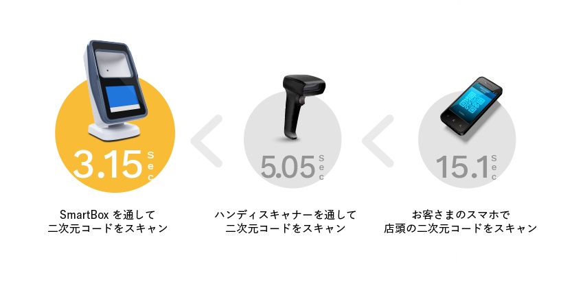 「SmartBox」を導入することにより、決済にかかる時間が大幅に短縮され、よりスピーディーな決済が可能になる。従来はユーザーがスマートフォンを使って店舗側の二次元コードを読み込んで決済する方法が主流だったが、「SmartBox」があればユーザー側の二次元コードを読み込むことで決済ができるため、双方の負担が大幅に削減され、従来の方法と比較すると、約12秒※も短縮される。