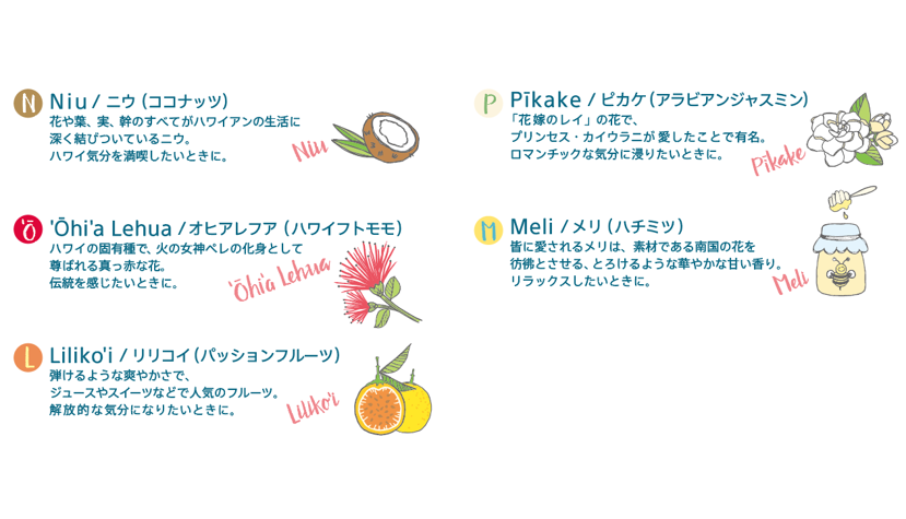 さらにパッケージイラストはハワイでも人気のアーティストであるニコール・フェララさんが担当し、香りの名前にもハワイ語を採用している。