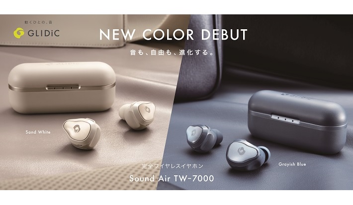 「動くひとの、音」をキーメッセージにした、GLIDiCの完全ワイヤレスイヤホン「Sound Air TW-7000」から新色「グレイッシュブルー」と「サンドホワイト」が登場。2019年10月25日より、GLIDiC取扱店(一部店舗を除く)およびSoftBank SELECTION オンラインショップ、Amazon、Yahoo!ショッピングなどで販売されている。