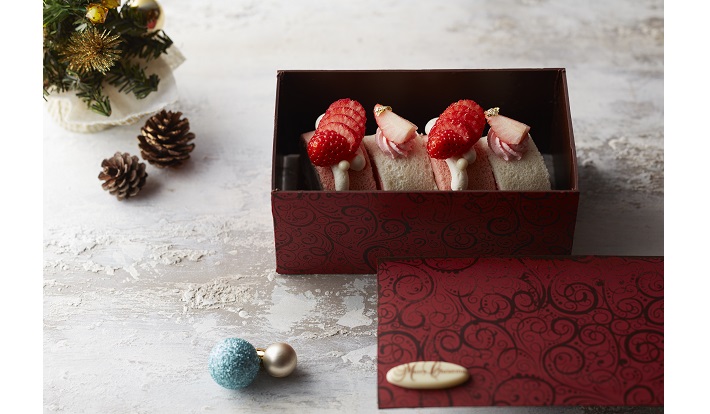 30個限定で販売する「サンタクロースからの贈り物」は、チョコレートでできた高級感のあるボックスを開けると可愛らしいロールケーキが登場するサプライズ演出付きのケーキ。ピンク、緑、白の3種類のブッシュ・ド・ノエルは、それぞれルビーチョコレート、ピスタチオ、ココナッツをベースにし、何層にも重なった上品な味わいを堪能できる大人向けのクリスマスケーキに仕上がっている。カットすると色鮮やかで繊細な断面が現れ、見た目も味も楽しめる。