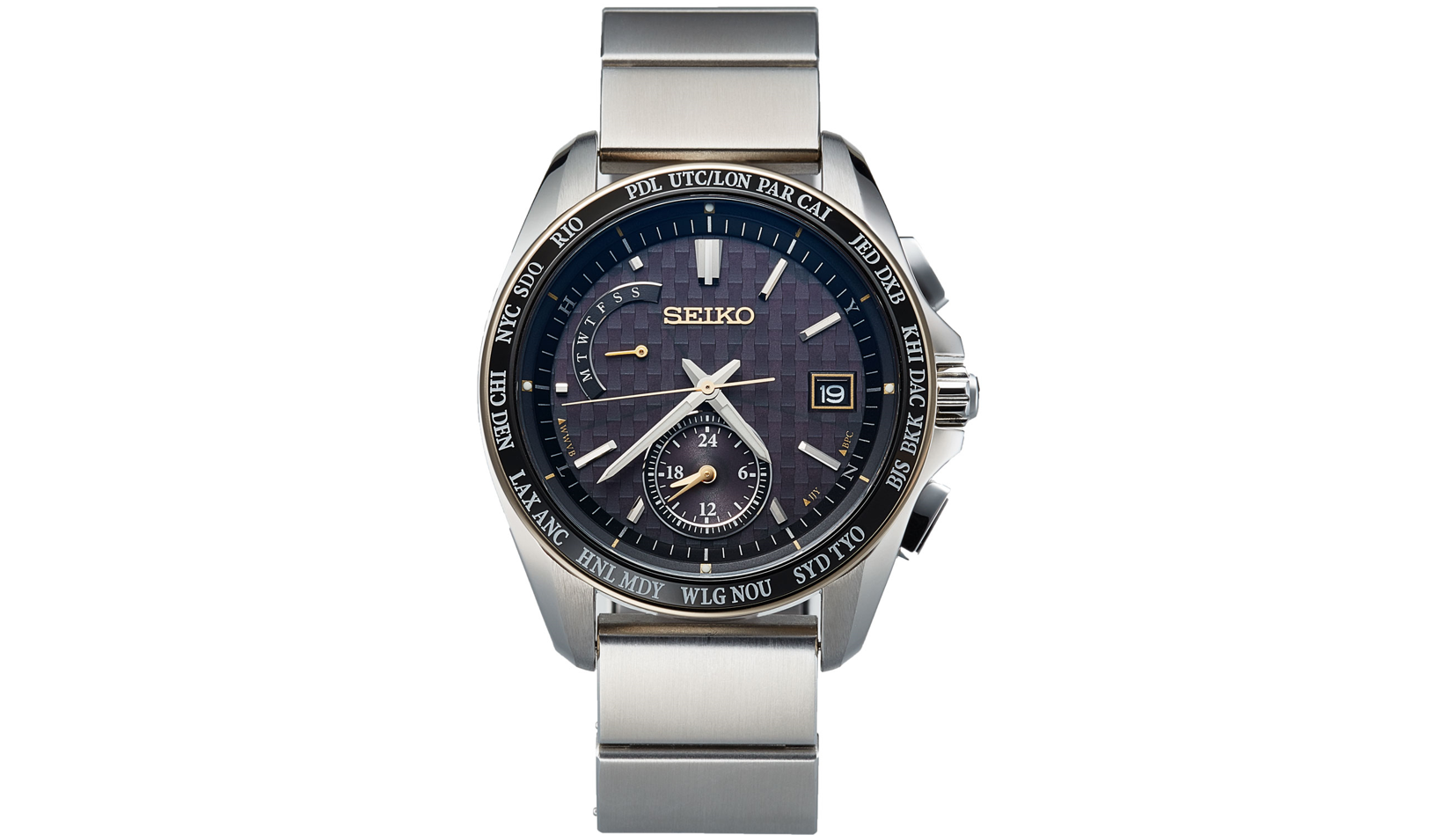 ・デュアルタイム(第2時間帯)表示機能やレトログラード方式の曜日表示機能を搭載。