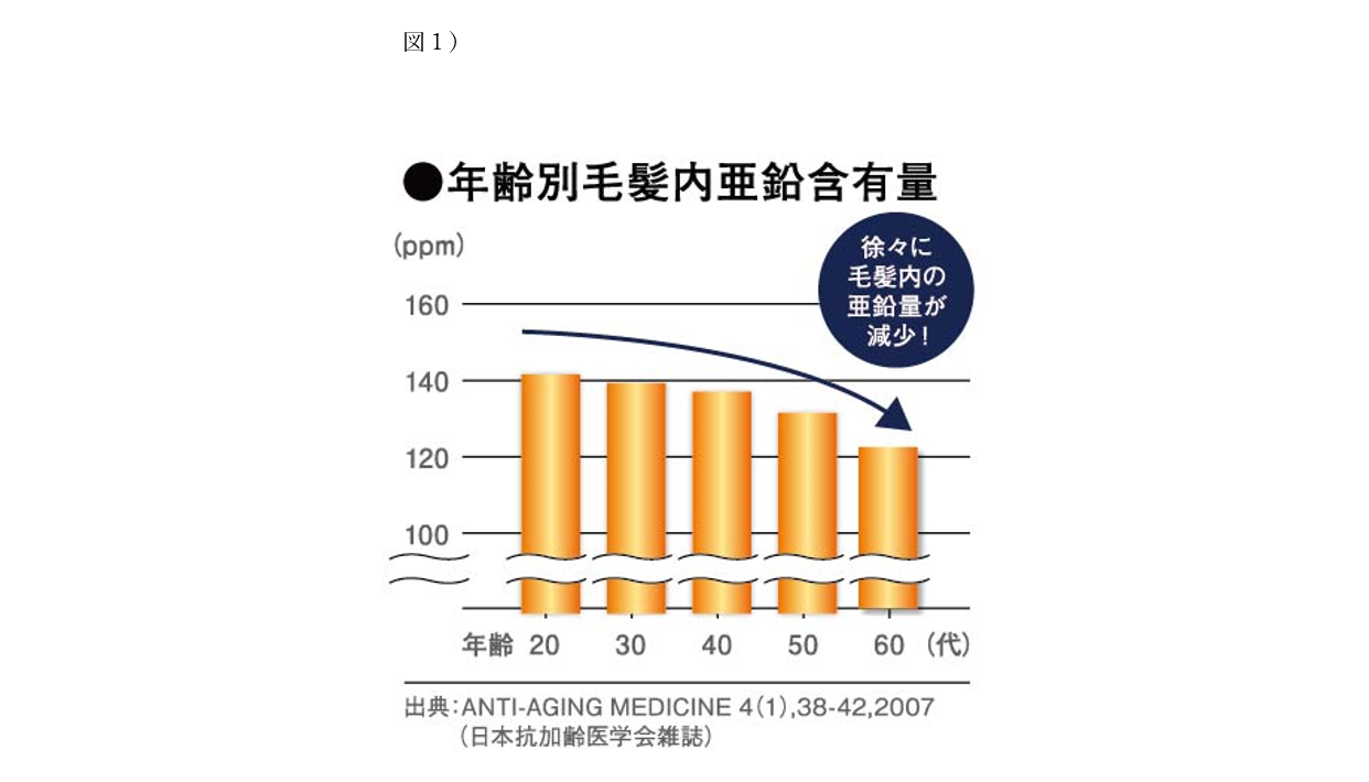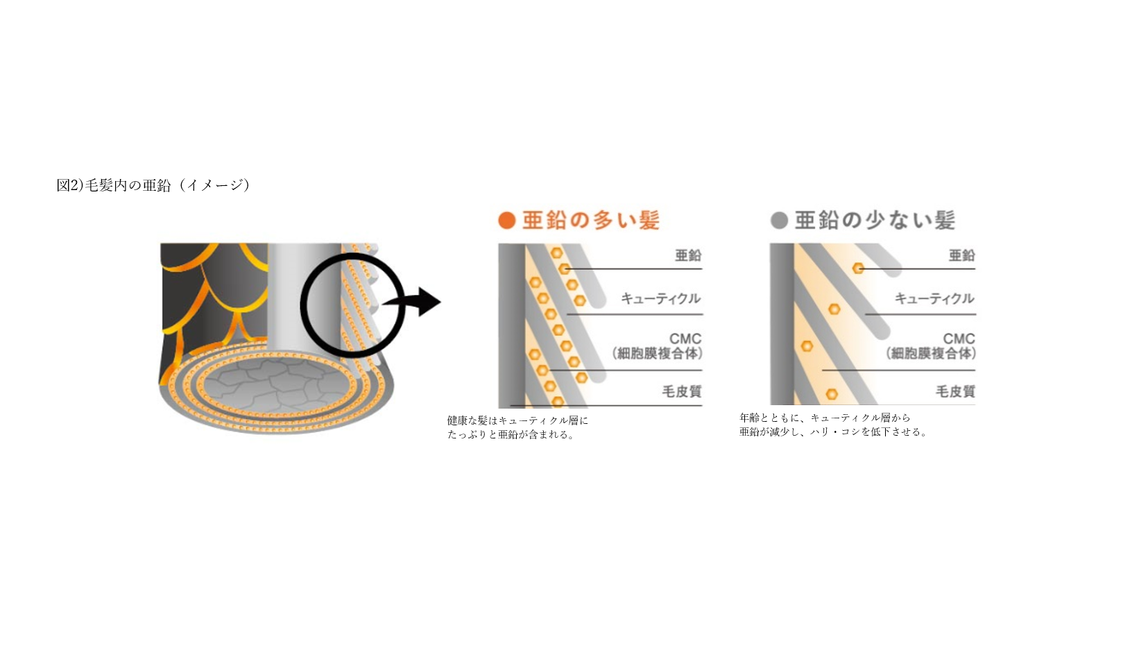 さらに、40歳ごろから減少し始めるといわれる毛髪に亜鉛を補うことで、髪が補強され、ハリ・コシのある強い髪へと導かれることを見出している。