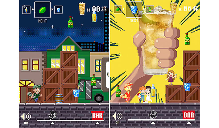本ゲームはレトロかつクールな8bitの横スクロールゲーム。日本でもアイルランドでも人気の爽やかなカクテル「ジェムソン・ジンジャー&ライム」の材料を正しい順番に集め、ゴールのバーに辿り着くまでに何杯のカクテルを作れるかを競う。