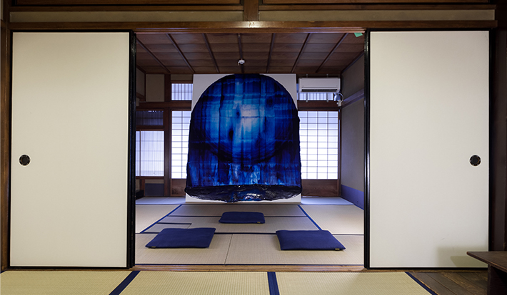 築約140年の町家空間「庵町家ステイ 筋屋町町家」の中で、只ならぬオーラを放っていたのが、青色の「一筆書き(one stroke)」を描く香月美菜の大作である。京都での初個展である今回は、これまで制作してきた作品のなかで最大サイズとなる「2m50cm」に及ぶ、大作に挑戦した。会場には、アーティストとしてデビューする前に制作した「one stroke」のアイデア源となった小作品、作品の青色を構成している233色の絵具を並べたドローイングも展示。精神統一させて一筆書きする様子を捉えたドキュメンタリー映像とともに、制作の過程にも触れられる展覧会となっていた。