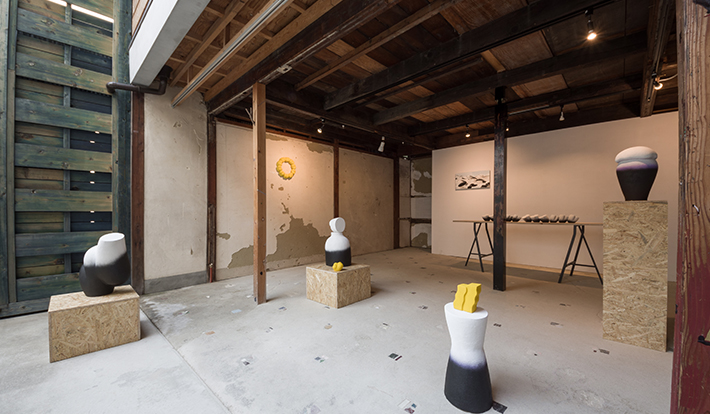 アートホテル「KYOTO ART HOSTEL kumagusuku」では、横浜美術大学を卒業した高橋美衣の作品が展示された。高橋は元々、乾漆の技術を用いて作品を制作していたが、だんだんと漆の素材感よりも、造形的な方向へと興味のベクトルが向いていく。漆以外の素材にも触れるようになり、今回の展示では主にテラコッタや石膏を用いた新作が並んだ。スペースのオーナーである矢津吉隆は、高橋についてこう語る。「形に対するこだわりがとにかくすごい。絵に描いて形を決めて、そこに向かってつくるのではなく、触ってつくっていく中で形を追求していく。そうして、抽象的でユニークなフォルムを生み出しています」。