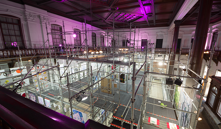 京都文化博物館 別館は、日本を代表する建築家・辰野金吾とその弟子・長野宇平治が設計した明治を代表する近代建築として重要文化財に指定されている。そんな趣のある空間に建築現場さながらの足場が天井まで組まれたほかにはない空間で、現代アートを鑑賞できるのも、本フェアの見どころの一つとして人気を呼んでいる。