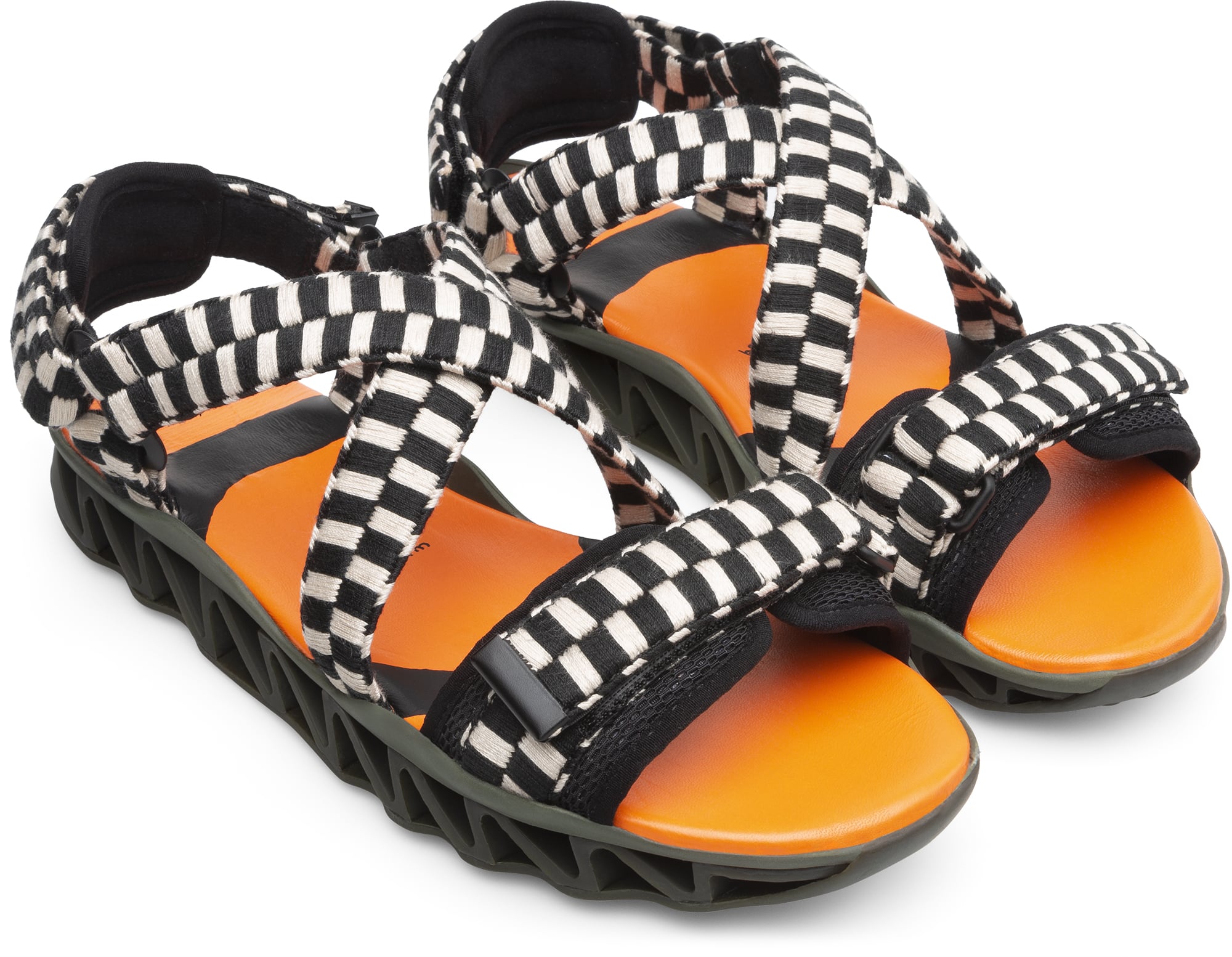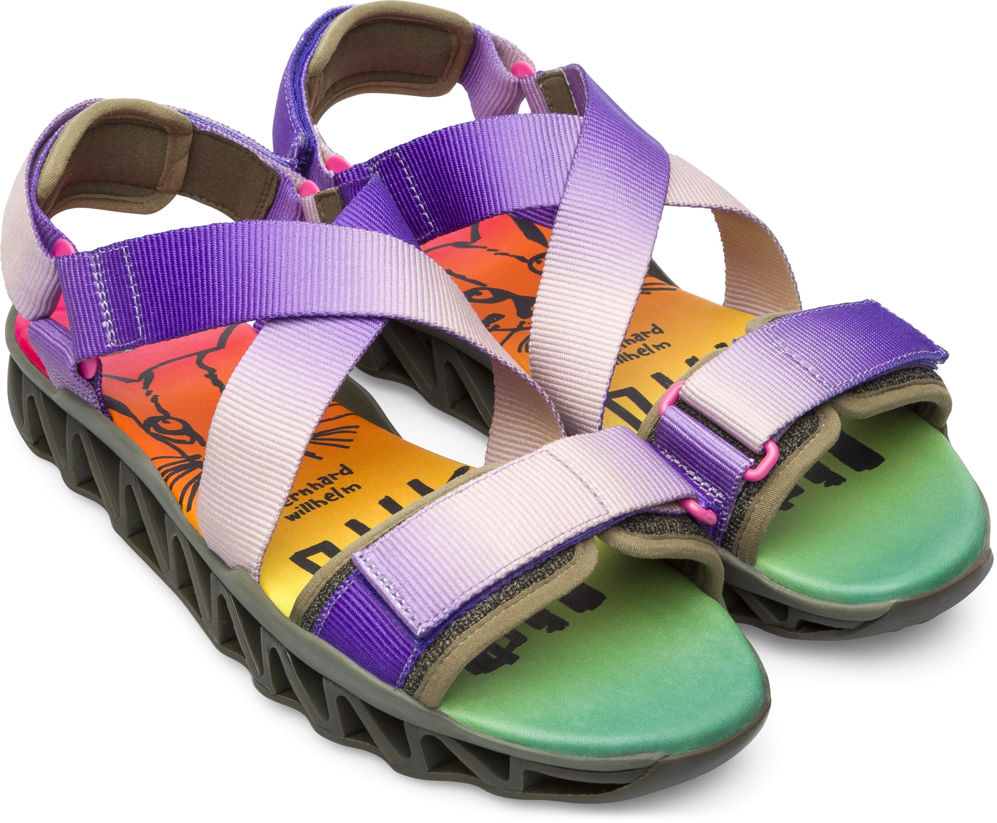 2つ目のコンセプトは、夏のストラップサンダルの新デザイン。鮮やかなネオンカラーのグラデーション、バイカラーの市松模様、そしてウィルヘルムらしい手描きのグラフィックを施したサンダルとなっている。アッパー部分には再生PET素材やテクニカルファブリックを使用し、インソールはシープレザーで柔らかで弾力のある履き心地を実現。着物のぼかし染めや市松柄などを思わせるディティールは、長年日本との繋がりが深いウィルヘルムならではの発想だ。