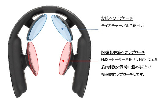 メディリフトネックは10分間着けることで、胸鎖乳突筋にEMS(電気刺激)でアプローチ。エイジングサインが気になる首の前面は、独自に採用したパルス波形「モイスチャーパルス」でケア。約40℃に温めるヒーター機能も搭載している。