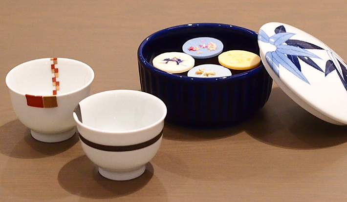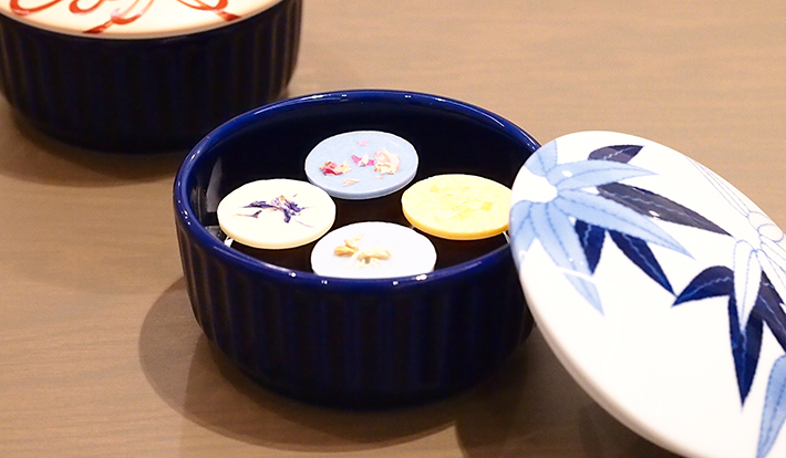 また、「トリュフ ヴェルメイユ4種」はオリジナルトリュフチョコレートと深川製磁の初代忠次が残した明治意匠図案の柄を染付け手法で描いたボンボニエールのセットです。