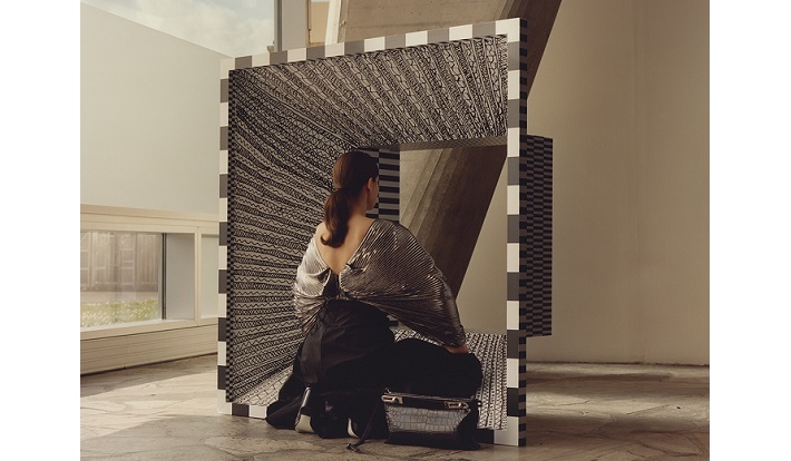 撮影では、四角いじょうごの形をした白黒のオブジェが、3月にコレクションのランウェイショーが行われたパリのユネスコ本部内のコンクリートホールに設置された。