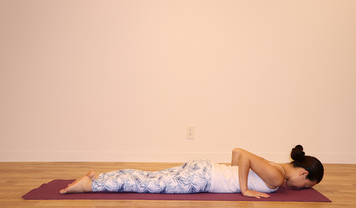 ①うつ伏せになり、脚を腰幅に開き、 足の甲を寝かせる。両手のひらは胸の横に置き脇をしめる。肘を 90 度に 曲げ、おでこを床につける。