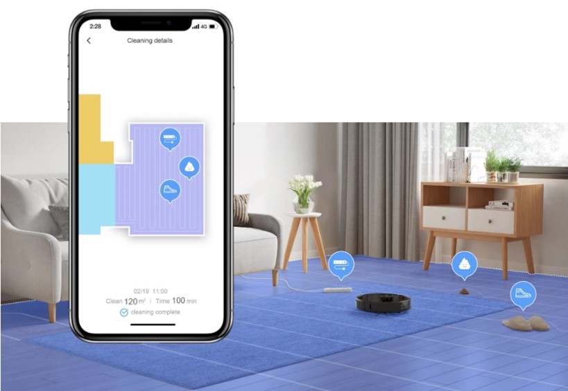 スマホアプリの機能も充実しています。部屋全体の掃除が一通り完了するとスマホアプリ上にマップを表示してくれます。また、スマホアプリ上から、掃除したいエリア、進入禁止エリア、水拭き禁止エリアの設定や、部屋ごとの吸引力・水拭きの水量の設定が可能です。その他、掃除する部屋の順番の指定や、1階、2階といった複数フロアのマップを4つまで保存することができます。