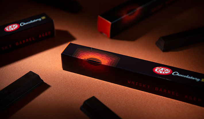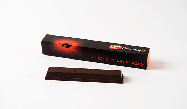新商品「キットカット ショコラトリー ウイスキーバレルエイジド」は、1週間に1回、人の手で回されるウイスキー樽の中で180日間熟成されたカカコニブを使用した、新製法の"エイジングチョコレート"である。