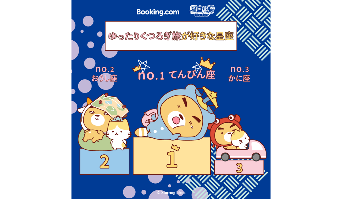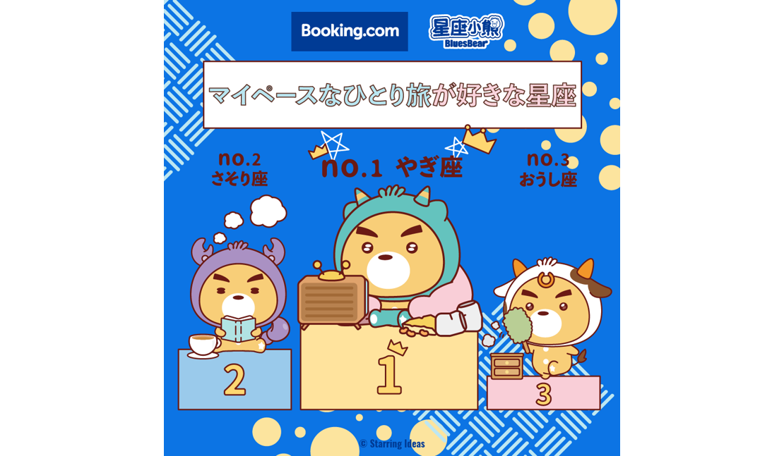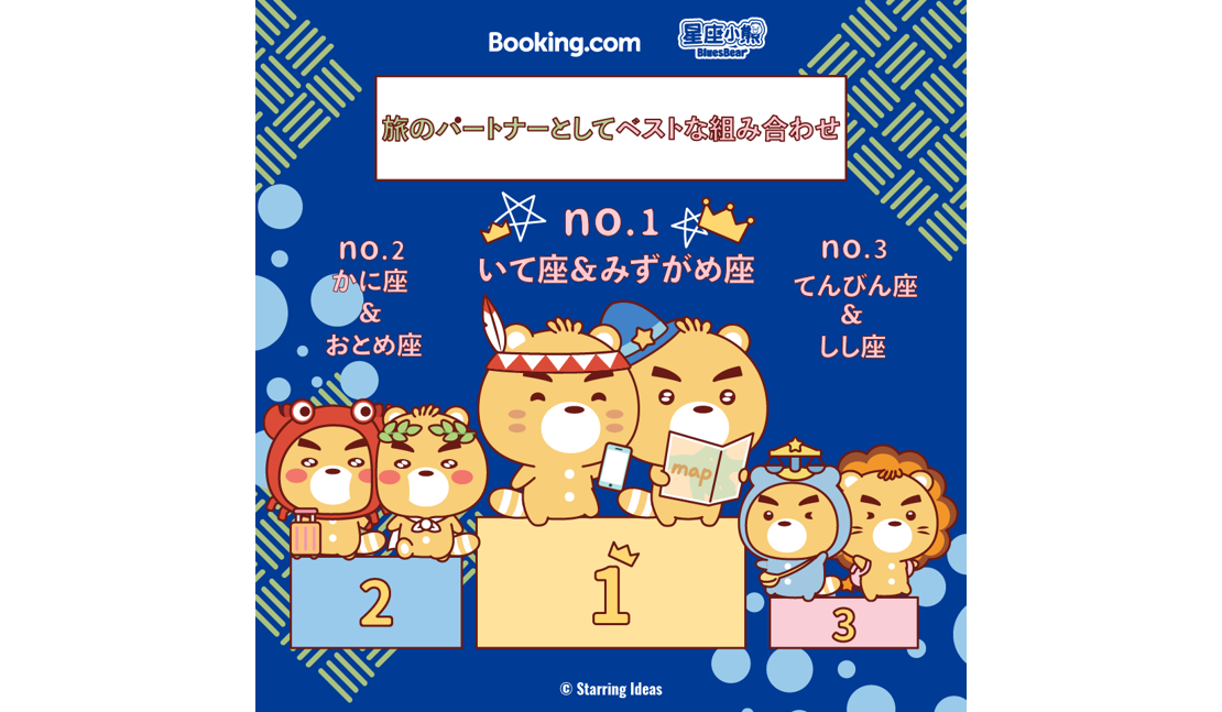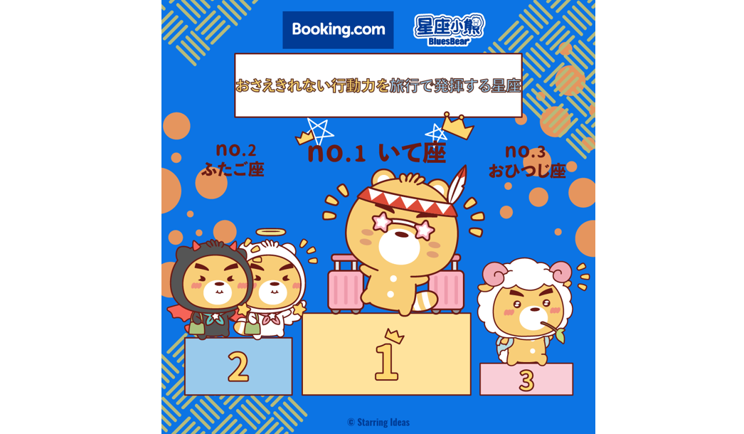 Booking.comより、先ごろ実施した調査※にて、世界の旅行者の61%が、「今年は旅行できることの楽しさをもっと味わいたい」と回答したことを受け、台湾の有名占い師「Bluesbear」による、自分にぴったりの旅のパートナーを見つけられる「旅先での行動別星座ランキング」が発表された。