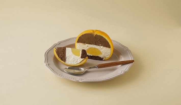 オレンジをまるごと一個使用し、切ると中からケーキが現れるというサプライズケーキである。たっぷりの濃厚なチョコレートムースと爽やかなヨーグルトムース、そして、相性抜群のオレンジジュレが詰め込まれた、贅沢なショコラオランジュに仕上げられている。