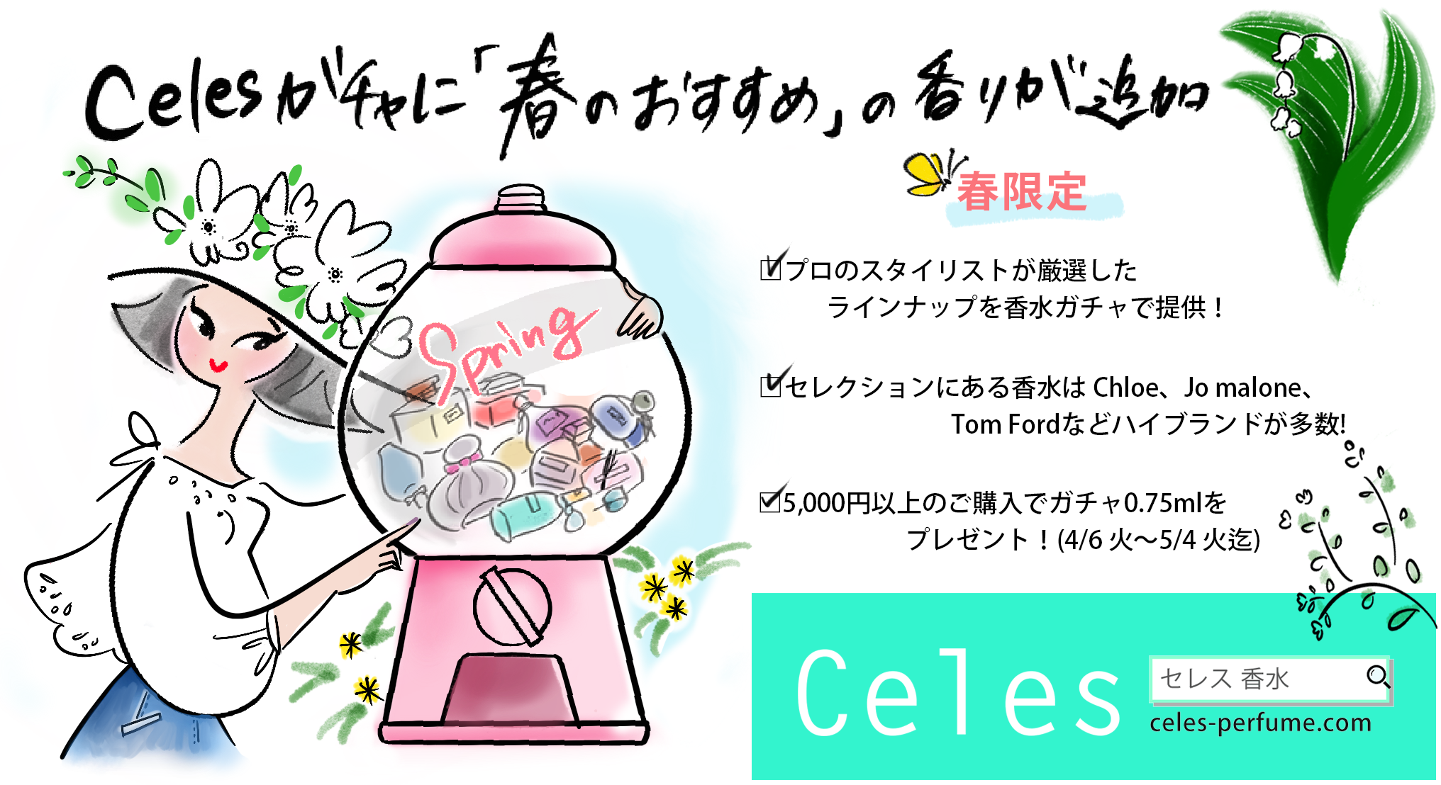 また新ラインナップを記念して、「Celes」のサービスを税込5000円以上の購入で、「春の訪れを感じるフローラル、グリーンの香り」より、香水を1本プレゼントするキャンペーンを、5月4日(火)までの期間限定で実施中。
