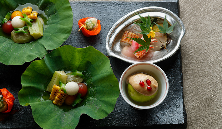 またフランス料理 エステールは、青森の海から届いた剣先烏賊や、高知産ののどぐろを使用した料理など、夏の大地と海の恵みに感謝し、日本の素材を活かした料理をお届け。加えて専属契約農園として提携する、有機栽培の野菜を生産する山梨の農園「白州杜苑」から届 く、安心安全で地産地消に根付いた夏野菜も用意された。