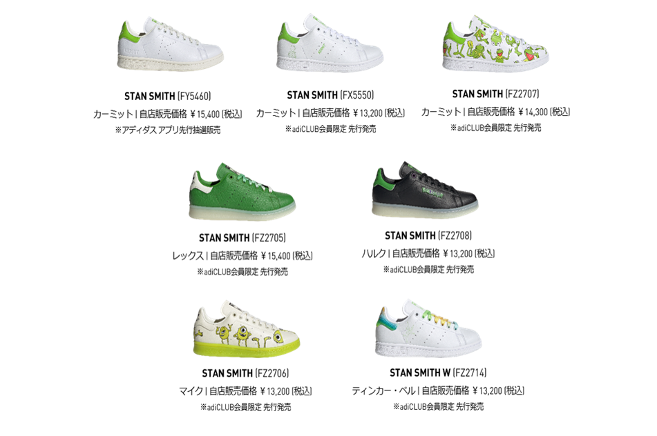 ウォルト・ディズニー・カンパニーが保有する象徴的なグリーンのキャラクター(「マペッツ」のカーミット、マーベルのハルク、「トイ・ストーリー」のレックス、「ピーター・パン」のティンカー・ベル、「モンスターズ・インク」のマイク・ワゾウスキ)にインスパイアされた各スタンスミスのモデルは、それぞれの世界観を表現したデザインになっている。