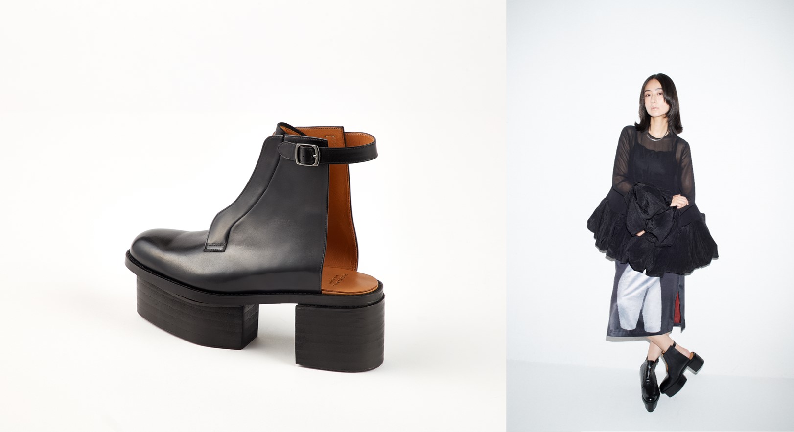 特徴:ソールを通常より約5cm厚く設計し、大胆なボリューム感に。アッパーが元のデザインのままだと全体のバランスが少し悪くなるので、爪先周りにも厚みを加えた、ぽってりとしたシルエットを提案。木型から新たに作成された。