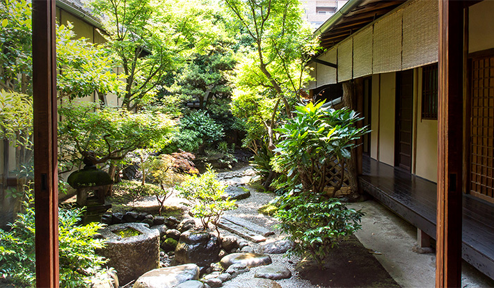 施主でもある創業者の方は趣向の凝らした教養が溢れており、そのこだわりは茶室をはじめとする部屋の細部や天井の作り、そして奥にある日本庭園に表れている。茶室などは上得意様をもてなしたり、展示会場としても使われていたようだ。また、この場所「岩戸山町」は京都祇園祭の山鉾町の一つで、目の前に岩戸山(山鉾)が建つ。
