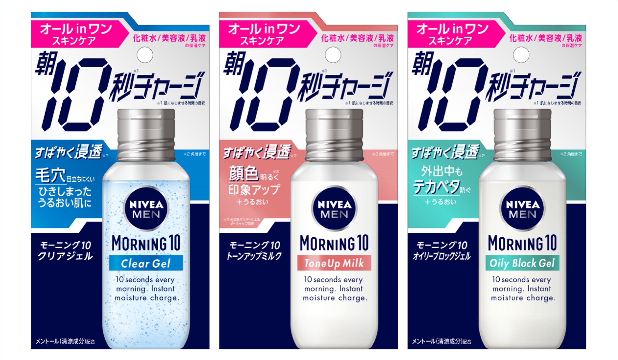 そこでこのたび「ニベアメン」から朝10秒(*1)でうるおい好印象肌のケアができる『ニベアメン モーニング10』シリーズが発売。一日の始まりの朝に、手間も時間もかけずにケアできるオールインワン(*3)スキンケアシリーズで、印象悩みに合わせて選べる3つのラインナップだ。