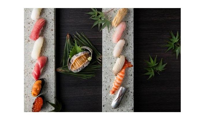 秋刀魚のつみれ小鍋や、秋鮭のいくら、カツオなどの旬の食材に加え、国産のあわびが刺身、寿司、煮あわびの3種類を提供するコース。7時間煮て作る煮あわびはやわらかく最高の味わい。