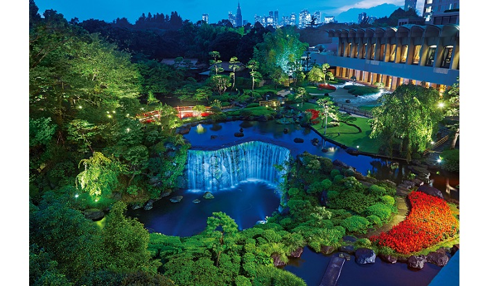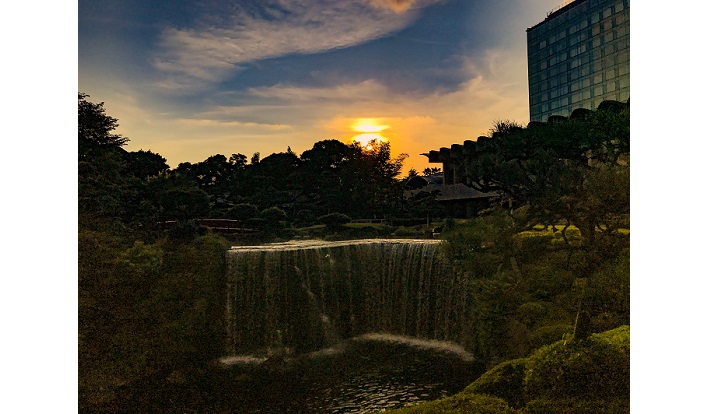 日本庭園に沈む夕日の美しいコントラストをバックに乾杯すれば、忘れられない一夜になること間違いなし。