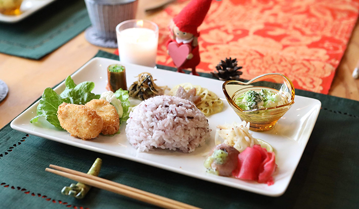 ナーランダでは、その土地ならではの美味しいものを昼食にご用意。今回は、熱した瓦の上に茶そばと具を載せた、山口県を代表するソウルフード「瓦そば」と、家庭精進料理研究家・MAKIさんによる山口の野菜をたっぷり使った創作精進料理です。