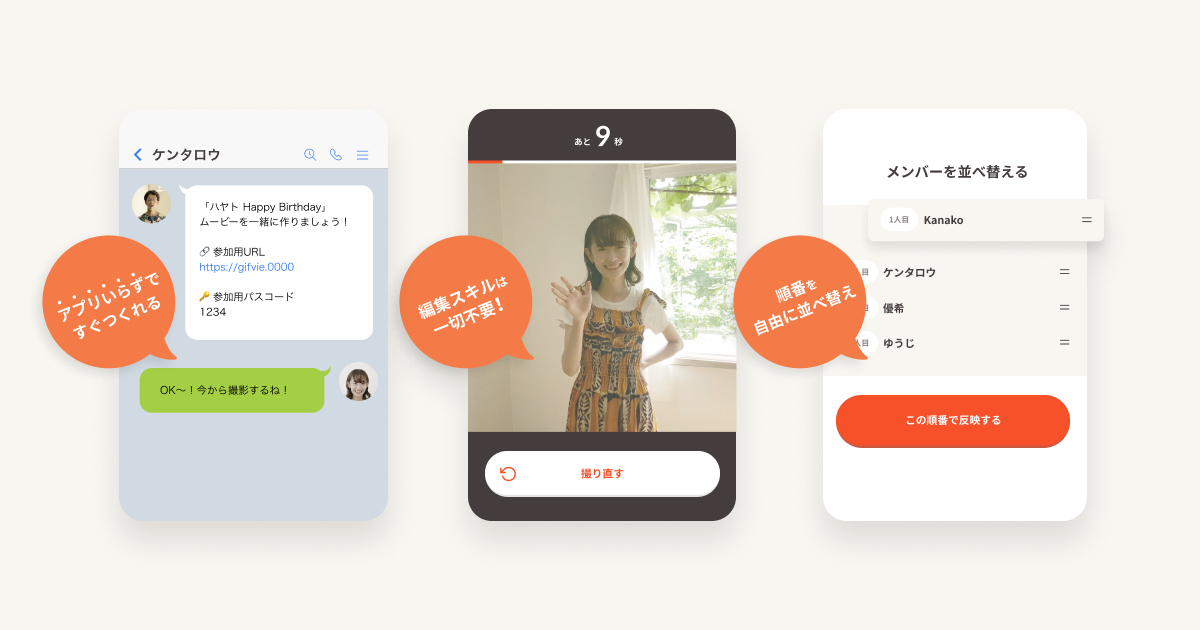 「Gifvie」は、メッセージ動画をスマホで自撮りするだけで、複数人でのメッセージムービーを作成できるサービスだ。幹事の進行管理や、編集スキル、専用アプリは不要で、3ステップで簡単に作成が可能。