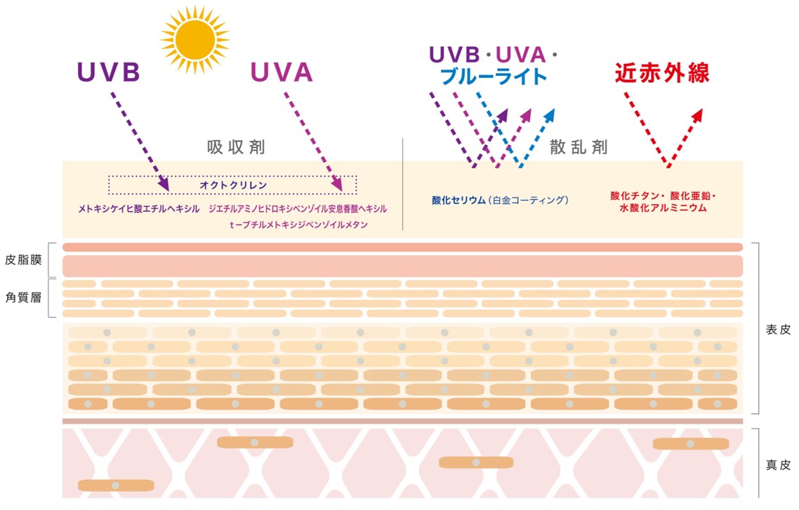 4種の紫外線吸収剤、3種の近赤外線散乱剤、さらにブルーライト散乱剤の計8種ものサンスクリーン成分を厳選し贅沢に配合。