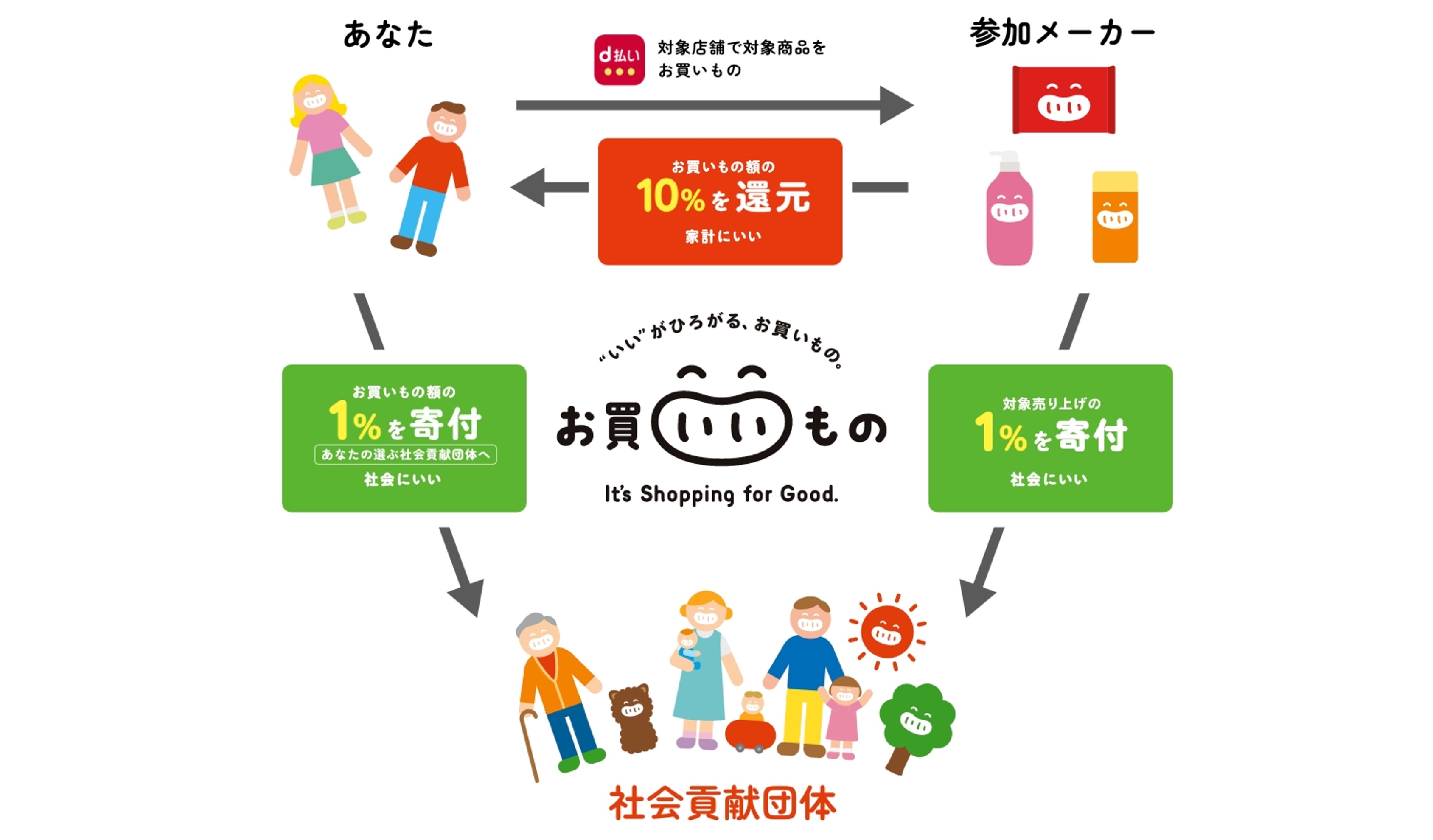 本プロジェクトは、9月1日より対象店舗で対象商品をd払い(コード決済)で購入すると、お買いもの額の1%が、購入者ご自身の選ぶ社会貢献団体へ寄付され、購入者にも最大10%還元されるという取り組みになっており、花王株式会社、ネスレ日本株式会社、株式会社NTTドコモ、株式会社電通の4社と流通企業20社の参画が決まっている。