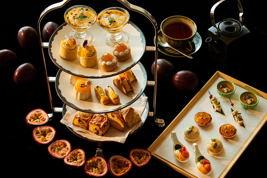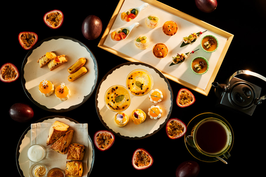 趣向を凝らしたスイーツ、スコーン、セイボリーは、パッションフルーツをたっぷりと使用し、見た目も華やかで甘酸っぱくも爽やかな味わいを楽しめる。