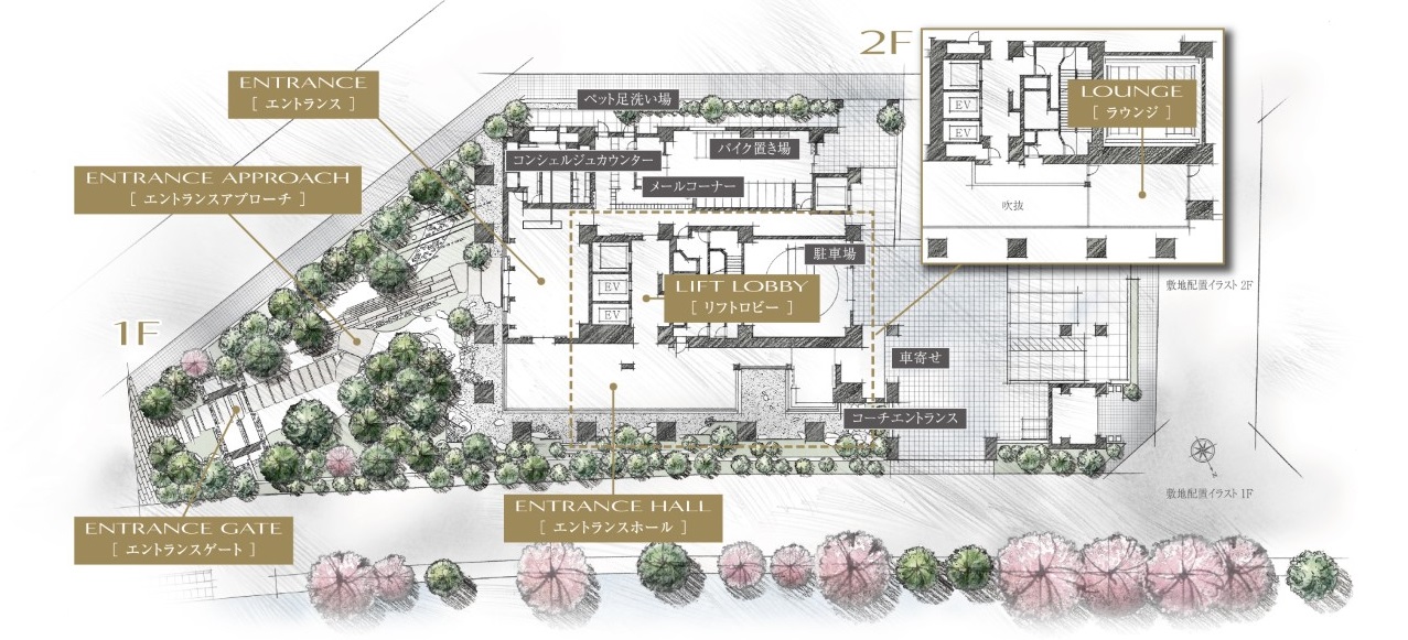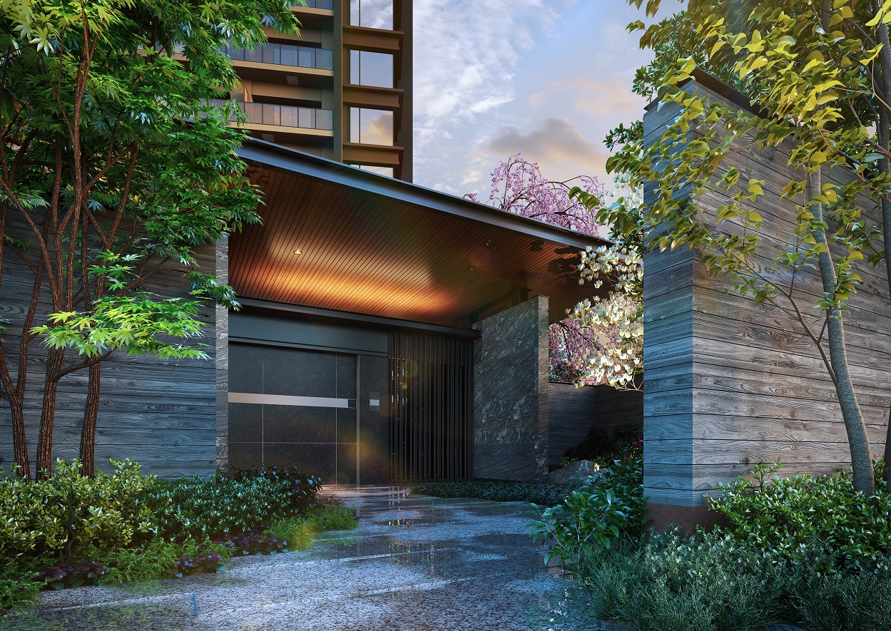 J R山手線五反田駅徒歩5分の好立地でありながら、日本独自の空間文化を用いることで築地塀と門と庭に囲まれたタワーに緑、水、石の潤いと庭を用いて静寂の空間を創出。都心にありがちな複合用途のタワーマンションと異なり、レジデンス専用タワーマンションだからこそ実現できた静寂かつ上質な空間を確保している。