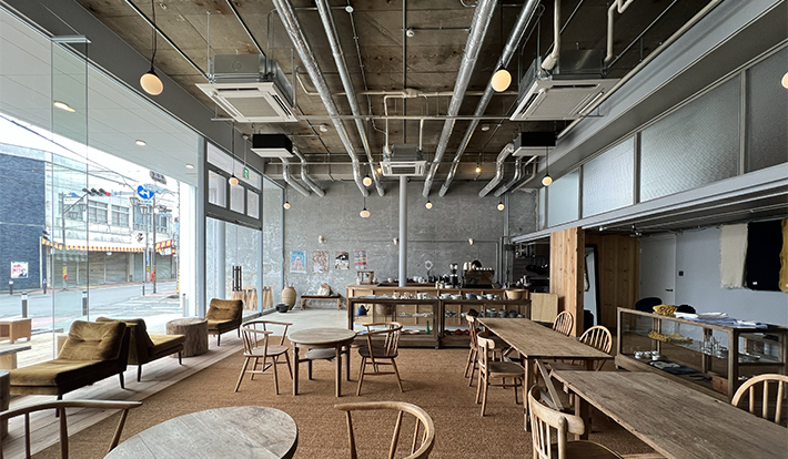 富士山を望む本町通りに構える店内は、カフェの他にアートや建築、テキスタイルなどの図書コーナー、リソグラフを楽しめるスペースやコワーキングスペースも併設する。カフェで一息しながら、人や作品との新たな出会いを楽しもう。