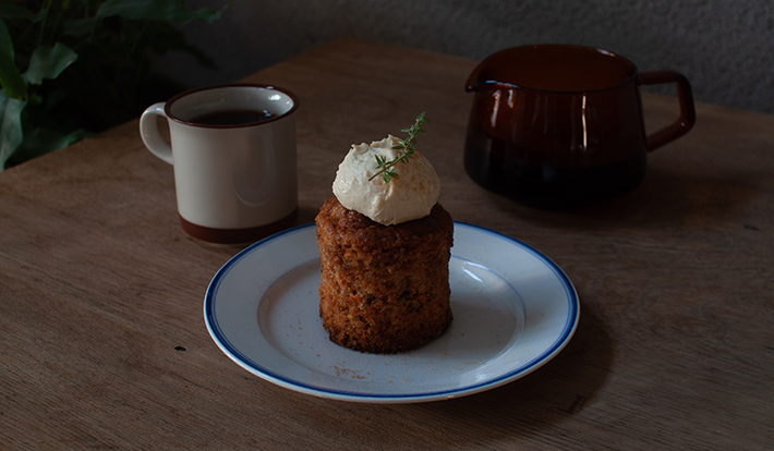 (左)カフェ前の通りからの風景 (右)キャロットケーキ 605円(税込)