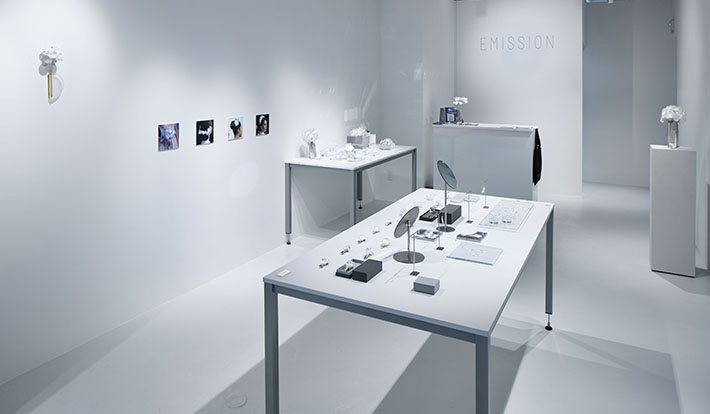 左)松尾がディレクターとして率いるブランド+スタジオEMISSIONのポップアップ。インテリアオブジェやジュエリーから、大規模なインスタレーションやシャンデリアまで、スペシャリストが東京・銀座で一点一点制作しています。