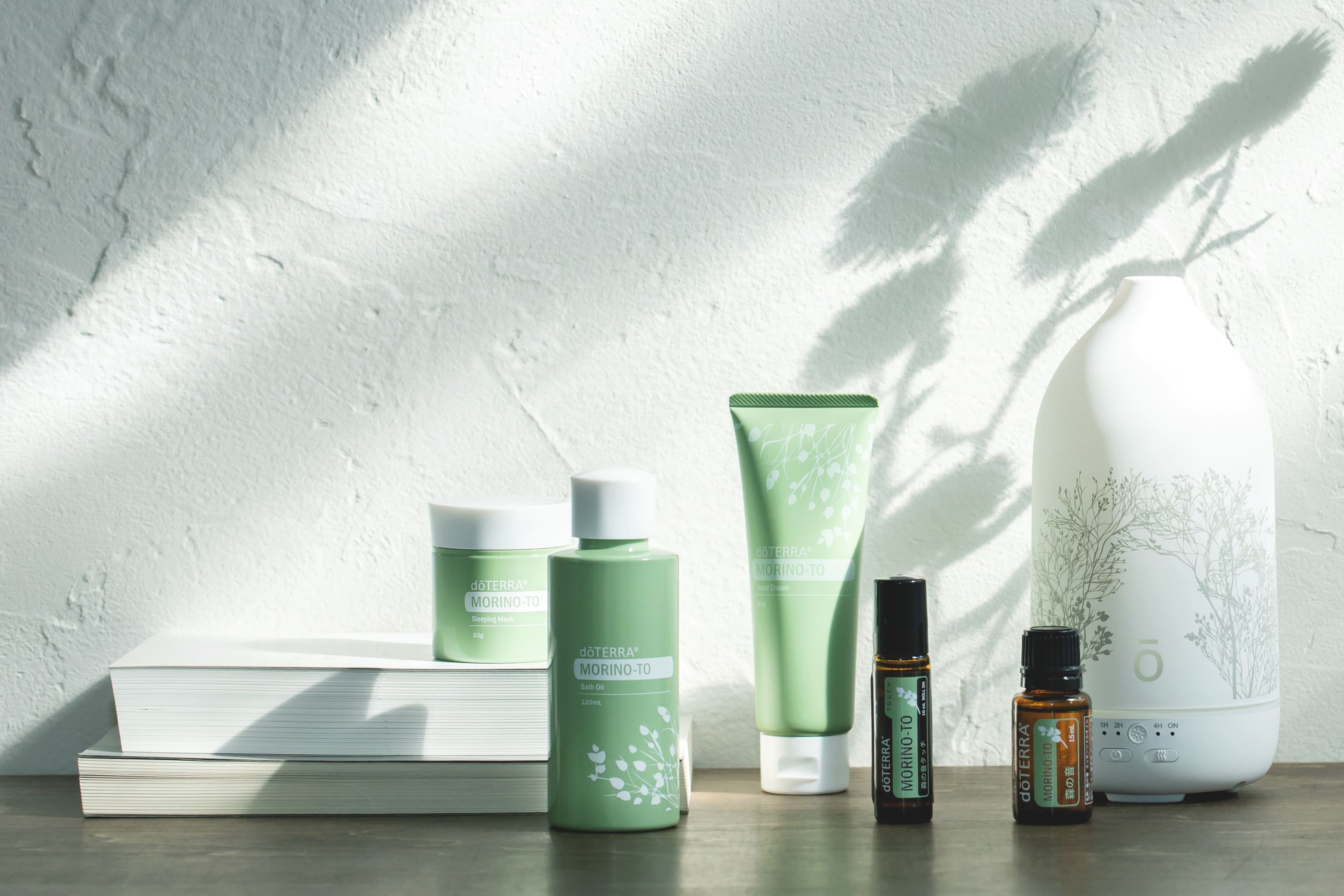 体内時計の乱れによって生じる肌トラブルにはたらきかけ、健やかな肌へと導くブドウ果実エキス、エイジングケア*にアプローチするバクチオール(植物由来のレチノール)、そして森の音ブレンドオイルを組み合わせたドテラのオリジナル複合成分[森の音コンプレックス]を配合。入浴後もうるおいを保つ美容液のようなバスオイル、夜寝ている間に肌リズムを整えて朝みずみずしい肌へと導くスリーピングマスク、サラッとしたタッチでしっとりうるおいを持続するハンドクリーム。森林の香りに癒やされながら肌のお手入れができるパーソナルケア製品です。*年齢に応じたお手入れのこと