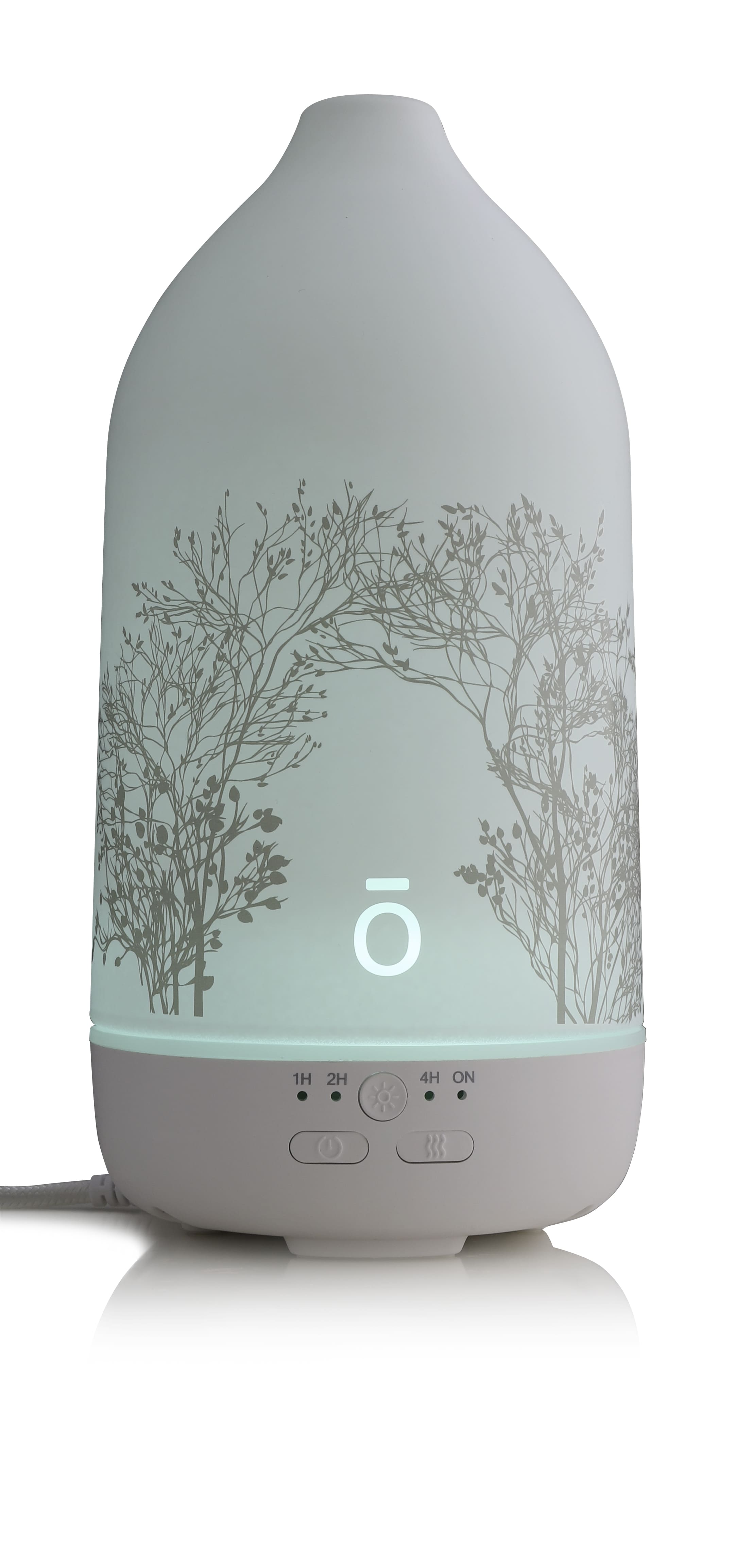 「ディフューザー付」コレクションには、「森の音」をイメージした超音波式のアロマディフューザーもセットに。白のほか緑にも点灯し、ライトをつけるとガラスカバーに描かれた森林が浮かび上がってお部屋を演出します。