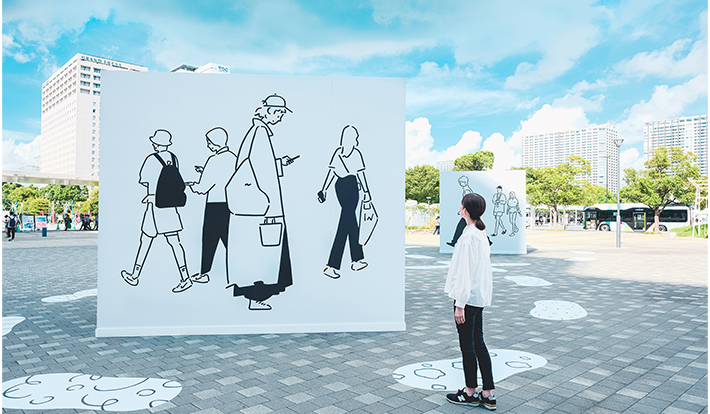 石と光の広場の向かいにある【花の広場】(写真:左)では、街で暮らす人々の日常を温かみのある筆致で描き出すアーティスト長場雄氏の巨大な作品が登場している。フィジカルな作品を楽しんだ後、QRコードを読み取り、スマートフォンをかざすと、イラストの人や街並みが目の前にたち現われる。眺めるというよりは、自分が新しい世界の住人になったような感覚が味わえるのが楽しい。