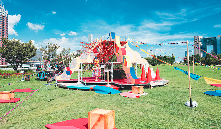 芝生が広がるシンボルロムナード公園内【夢の広場】では、テレビ番組の美術セットの廃材を活用したカラフルなシアターステージが設置され、さまざまなアクティビティが楽しめる。