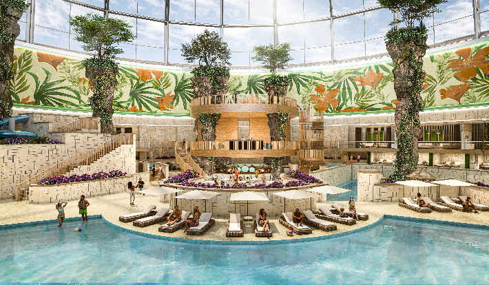 ガラスドームの形をした多目的屋内ウォーターパークは、昼はエキサイティングな水遊び空間、夜は幻想的なエンターテイメント空間に変わり、一年中楽しめる。豪華なカバナ、プールサイドバーやスイムアップバー、DJブースをはじめ、キッズ専用エリア、流れるプール、ウォータースライダーなど、ご家族で楽しめる多彩なエンターテイメントと空間を味わえる。