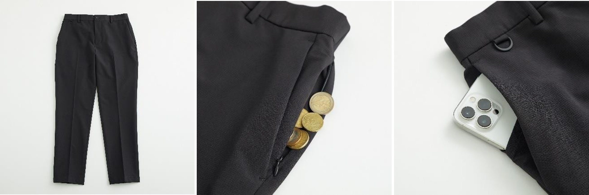 ・特長:ノープリーツの腰回りから裾にかけてすっきりとしたテーパードシルエットのパンツ。スマートフォンサイズのポケットやジップ付きのコインポケット、キーホルダー等を付 けられる D カンなどにより、さまざまな小物を忍ばせることができる便利アイテムだ。ウエストはハー フギャザー仕様でリラックスした履き心地となっている。素材(*)には、撥水性、ストレッチ性の あるダブルクロス生地を使用。表にはリサイクルポリエステル糸を使用し、裏面にはウール 混糸を使用することで、ウォーム感のあるタッチを表現。裏面は凹凸感があり、肌離れが良 いのも特徴だ。