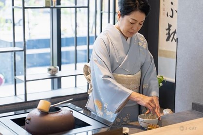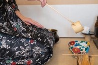 ・茶室「笹楽庵」にて⼥将のお点前の⾒学