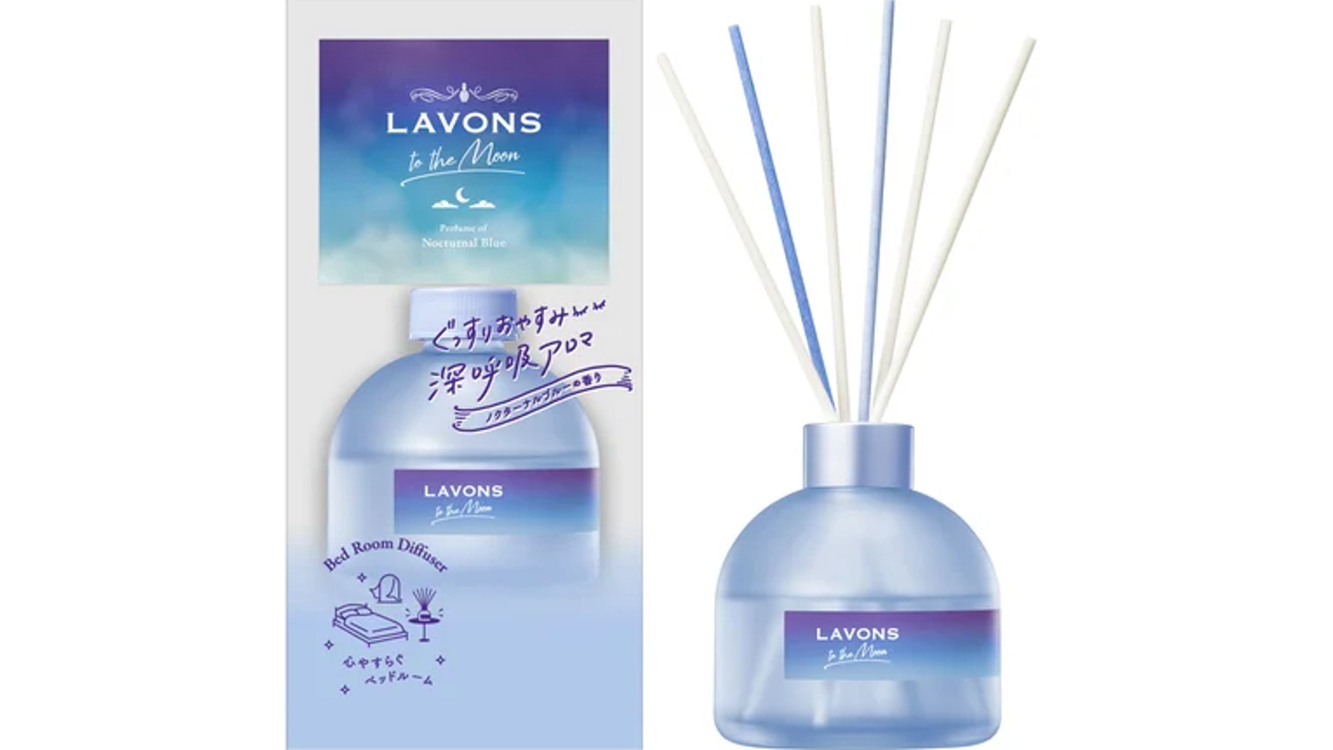 新登場の「ノクターナルブルーの香り」のベッドルームディフューザーは、「深呼吸・月夜の静けさ・心の穏やかさ」をキーワードに、ノクターン(夜想曲)をイメージしながら、だんだんと夜が深いブルーに変わっていく夜空と、うとうとと夢の中のような浮遊感と幻想感をグラデーションで表現している。また、すりガラス調の淡いブルーの落ちついたデザインであるため、ベッドルームやリビングにもなじみやすい商品となっている。
