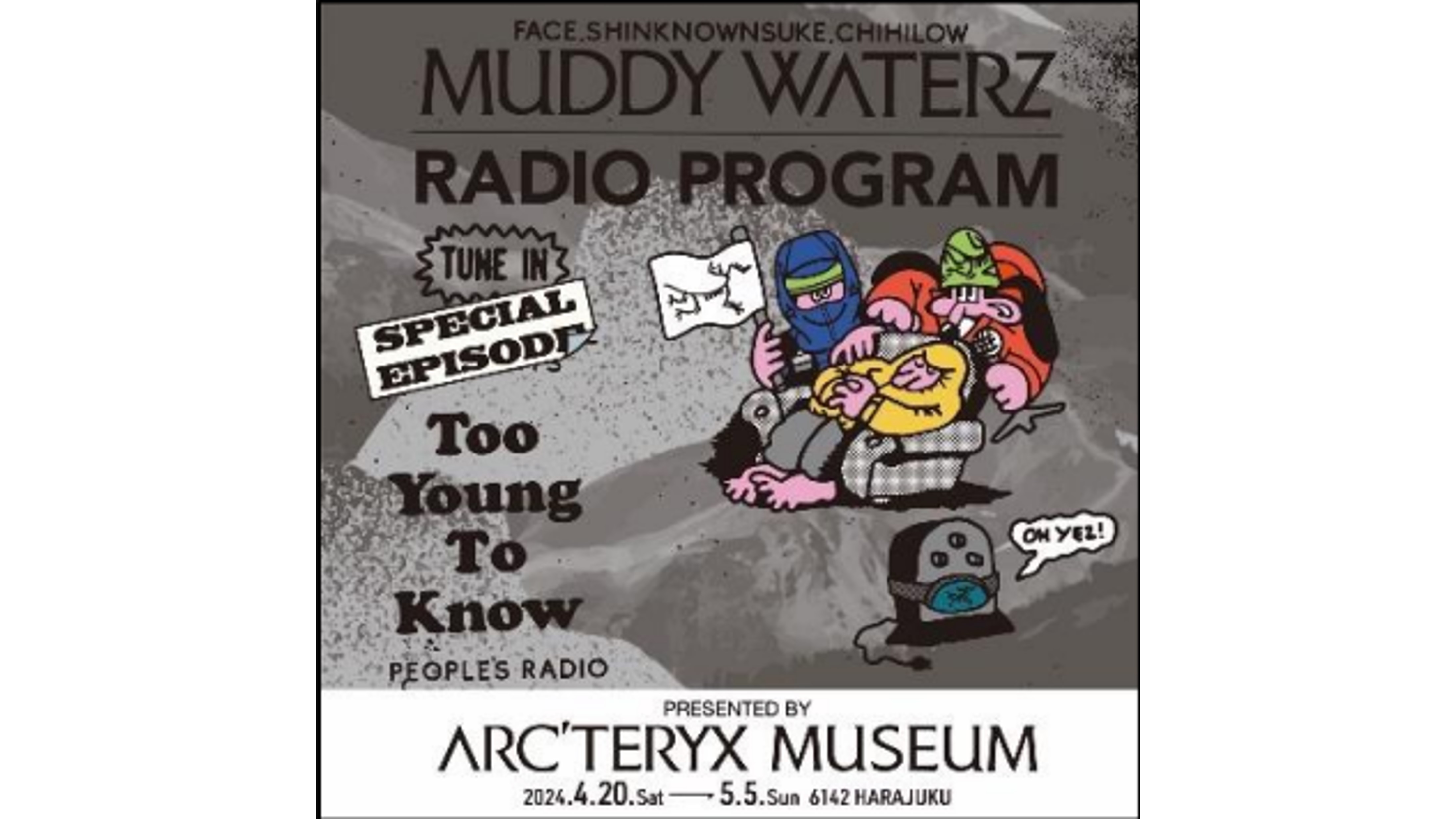 FACE,SHINKNOWNSUKE,CHIからなるmuddy waterzによるスローなラジオ「TooYoung To Know」の公開収録を実施。ラジオリスナーとアークテリクスのお客様から「アークテリクスにまつわるエピソード」を事前募集し、日頃からアークテリクスを愛用している3人のアークテリクス愛を交えて、フリートークを繰り広げる企画となっている。エピソードを読み上げられたリスナーとご来場いただいたお客様限定で、今回特別に作成したステッカーがプレゼントされる。